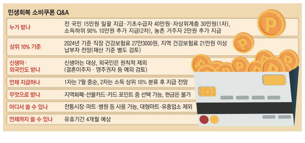 민생회복 소비 쿠폰 프로그램은 모든 시민이 참여할 수 있는 프로그램으로, 소득 상위 10%도 포함됩니다. 이 쿠폰은 두 차례에 걸쳐 지급되며, 특정 그룹에 추가 자금이 지원될 예정입니다. 쿠폰의 유효 기간과 사용 방법에 대한 정보도 중요합니다.