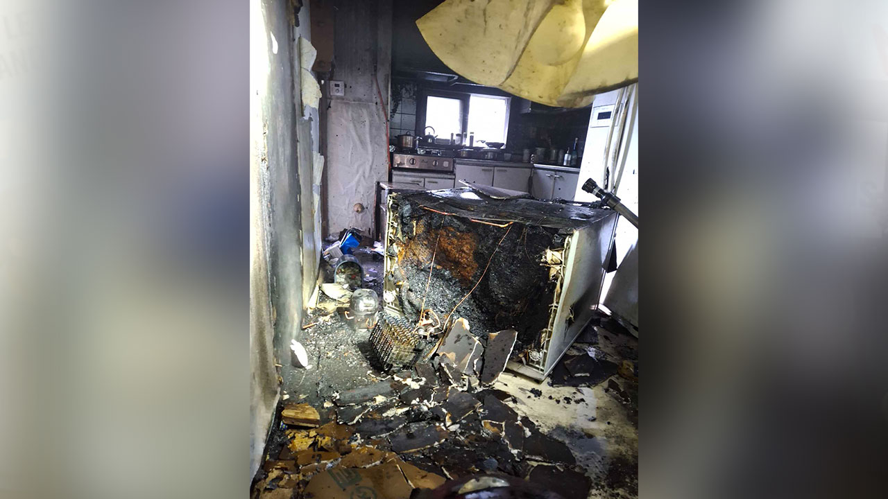 이 이미지는 화재로 인해 파손된 주방의 모습으로, 화재의 피해가 얼마나 심각했는지를 보여줍니다.