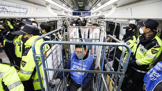 시위 현장에서는 많은 사람들이 모여 있었고, 그 중 일부는 지하철 바닥에 누워 시위를 하고 있었습니다. 한 여성은 마이크를 들고 열정적으로 구호를 외치고 있었고, 휠체어를 이용하는 사람들도 함께 참여하고 있었습니다. 이러한 모습은 많은 승객들에게 강한 인상을 남겼습니다.