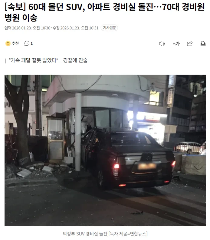 [3] 경기일보 - [속보] "가속페달 잘못 밟아" 60대 몰던 SUV 아파트 경비실 덮쳐 (https://www.kyeonggi.com/article/20260123580064)