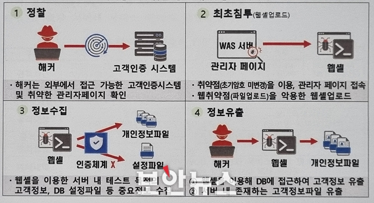 해킹의 과정은 여러 단계로 나뉘어 있습니다. 첫 번째 단계는 해커가 고객 인증 시스템의 취약점을 찾아내는 것입니다. 이후 웹 셸을 통해 초기 접근을 시도하고, 웹 서버와 데이터베이스에서 정보를 추출합니다. 마지막으로 해커는 개인 정보를 포함한 데이터를 빼내는 과정을 거칩니다. 이러한 해킹 절차는 매우 정교하게 이루어지며, 각 단계에서의 보안 취약점이 해커에게 기회를 제공합니다.